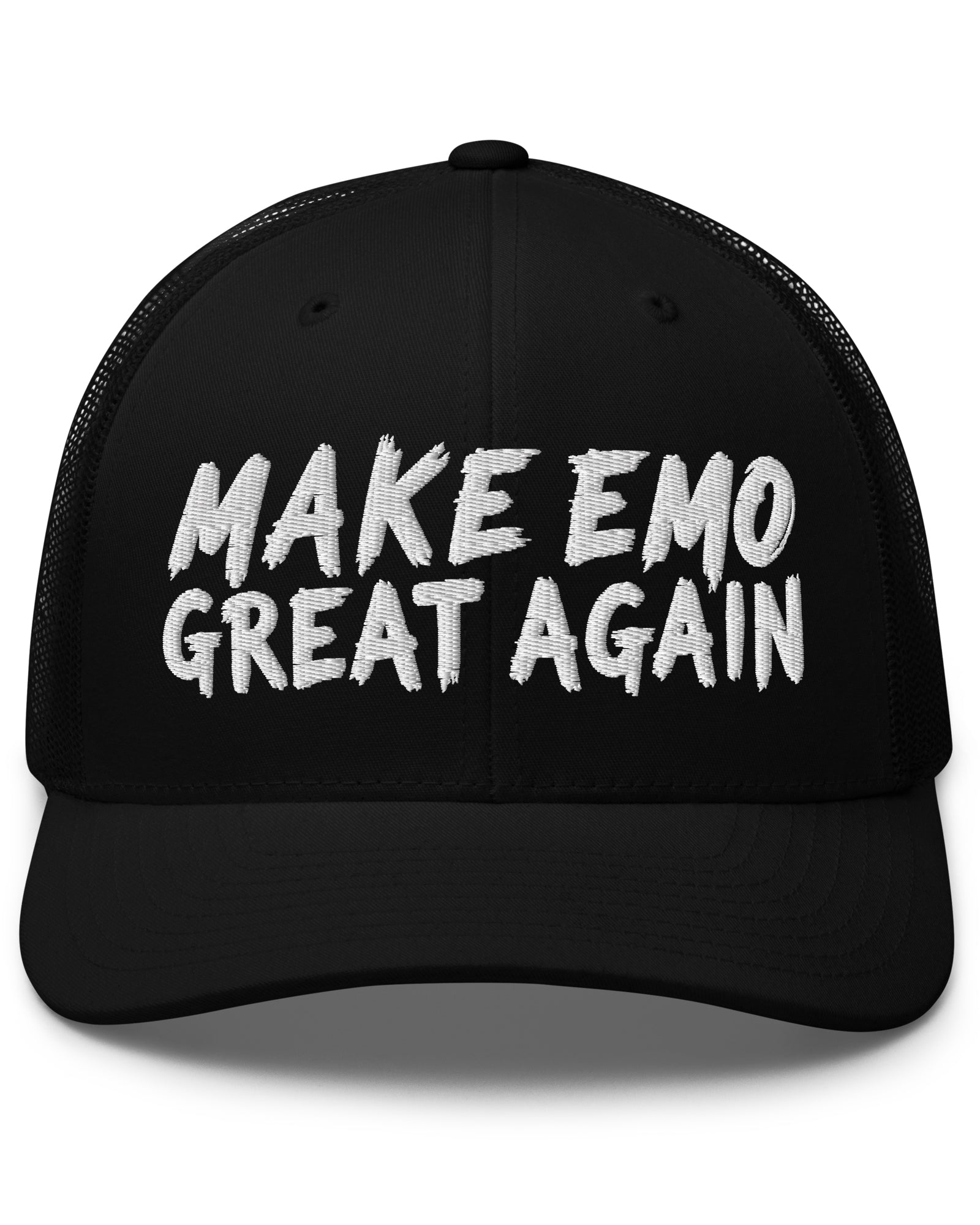 Emo goes outdoors.. reluctantly. The MAKE EMO GREAT AGAIN Trucker Hat keeps your head cool and your heart crying in 4/4 time.